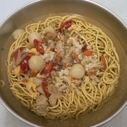 炸干意面、鸡肉片、水、红萝卜、大葱、红辣椒、鱼圆、蛋、蒜米、盐、味精、酱油、薯粉。