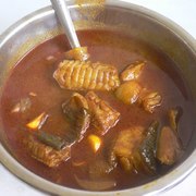 魔鬼鱼块、水、大葱、马铃薯、蒜、咖喱酱、酱油、椰浆水、咖喱粉、辣椒酱。