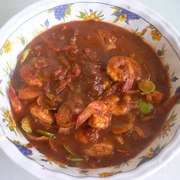 鲜虾、咖喱酱、椰浆水、葱蒜、茄子、红辣椒、番茄、香茅、酱油、咖喱粉、辣酱。