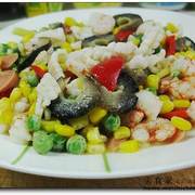 鱿鱼、水发海参、虾仁、豌豆、玉米粒、火腿肠片、红椒。