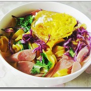 面粉、莴笋、胡萝卜、香肠、鸡蛋、香菜、虾仁、紫甘蓝、盐、鸡精、料酒、鲜汤、植物油、醋。