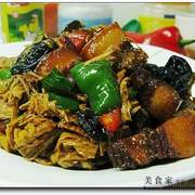 带皮三层肉、腐竹、青椒、红椒、葱、姜、蒜、冰糖、茴香。
