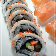 烤紫菜、米饭、黄瓜、胡萝卜、鸡蛋、飞鱼籽、三文鱼、寿司醋、精盐、青戒、欣和有机酱油。