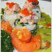 三文鱼、鱼籽、米饭、菠菜、西红柿、洋葱、蛋黄、猕猴桃、法香。