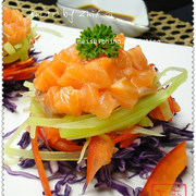 三文鱼、青笋、红椒、紫椰菜、法香、芥末、美极酱油、柠檬汁、橄榄油。