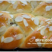 高粉、鲜奶、蛋液、黄油、糖粉、盐、酵母、提子干、杏仁片。