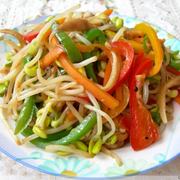 黄豆芽、大青椒、甜黄椒、甜红椒、菌菇、橄榄油、酱油、蒜泥、芝麻油、盐、芝麻盐、胡椒粉。