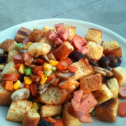 土司、脆皮肠、香菇、蘑菇、杂菜什锦、黄油、盐、黑胡椒。