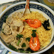 馄饨、方便面饼、油菜、水煮虾、鸡精、白胡椒粉、香油、酱油、醋、海苔、香葱、香菜。