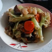 菜花、大虾、香菇、扇贝肉、胡萝卜、木耳、蚝油、白糖、盐、鸡精、水淀粉。