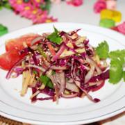 圆葱、紫甘蓝、苹果、香菜、炒香白芝麻、香油、盐、生抽、鸡粉、红酒醋、细砂糖。