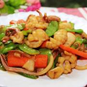 鱿鱼、荷兰豆、胡萝卜、姜、葱、油、盐、生抽、米酒、胡椒粉。