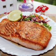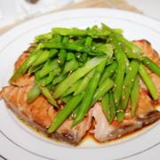 三文鱼、芦笋、白芝麻、橄榄油、香油、海盐、胡椒粉、生抽。