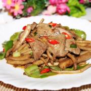 猪肝、茶树菇、青椒、葱、姜、生粉、油、盐、生抽。