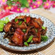五花肉、干豆角、桂皮、香叶、八角、姜片、葱花、干辣椒、油、盐、冰糖、生抽、老抽。