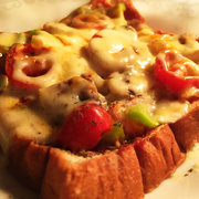 吐司、青椒、小番茄、沙拉酱、蘑菇、丸子、番茄酱、芝士。