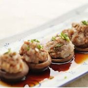 鲜虾、猪肉馅、大香菇或白蘑菇、芝士、土豆、黑胡椒、橄榄油、黄油、盐、酱油。