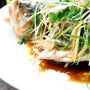 鲈鱼、姜、大葱、小葱、香菜、盐、胡椒粉、李锦记蒸鱼豉油、料酒、纯香麻油、自制混合豉汁料。