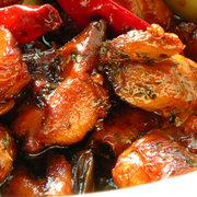 鸡腿肉、葱、姜、干辣椒、大蒜头、罗勒、老抽、麻油、冰糖、料酒。