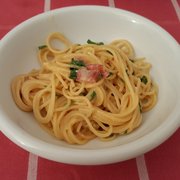 培根、鸡蛋、奶油、帕马森奶酪、意大利面、盐、黑胡椒。