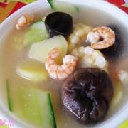 基围虾、土豆、鲜玉米、香菇、木耳、纯牛奶、盐、味精。