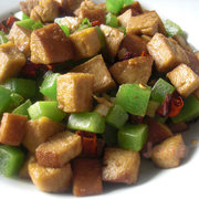 青笋、素鸡豆干、青椒、红椒、姜、蒜、花椒粒、盐。