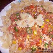 盐蛋、意粉、蒜、青辣椒、蔬菜丁、番茄、盐。