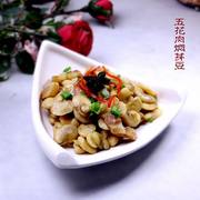 去皮泡芽豆、五花肉、香葱粒、甜椒丝、葱段、姜片、八角、绍酒、鲜酱油、蚝油、白糖、味精、白胡椒粉、水淀粉、烹调油。