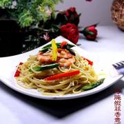 干制意大利面、鲜青虾、鲜芦笋、红黄彩椒、熟松子仁、姜片、香叶、大蒜碎、洋葱碎、黑胡椒碎、白葡萄酒、精盐、白糖、橄榄油。