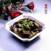 嫩茄子、水发黄豆、五花肉片、青蒜、六必居黄酱、葱花、姜末、蒜末、绍酒、白糖、味精、香油、烹调油、清水、水淀粉。
