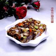 鲜猪皮、熏豆干、花生米、黄豆、青豆、胡萝卜丁、酱瓜丁、榨菜丁。