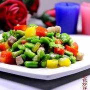鲜蚕豆、五花肉丁、红甜椒丁、黄甜椒丁、葱花、姜末、绍酒、精盐、白糖、鸡粉、胡椒粉、水淀粉、烹调油。