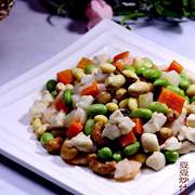 去皮青毛豆、水泡黄豆、鸡肉粒、虾肉粒、胡萝卜粒、荸荠粒、水发香菇粒、油炸腰果、烤花生米等。