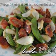 甜豆角、鲜百合、广式腊肠、葱、姜、蒜。