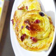 高筋面粉、低筋面粉、橄榄油 、鸡蛋、盐 、发酵粉 、细砂糖 、奶粉、牛奶 、黄油、鸡蛋黄液、蔓越莓干 。