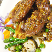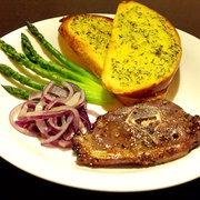 羊小切、芦笋、洋葱、面包、蒜蓉、干百里香碎、盐、黄油、黑胡椒粒、白胡椒粒、红酒、蜂蜜、美极鲜。