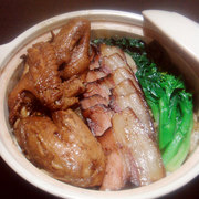 三黄鸡、腊肉、菜心、姜、生抽、老抽、玫瑰露酒、盐、桂皮、胡萝、香叶、大料。