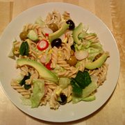 意大利面、黑绿橄榄、蔬菜、橄榄油、黑胡椒粉、苹果醋、盐。