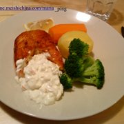 三文鱼、苹果、西蓝花、土豆、胡箩卜、苹果、胡椒粉、 柠檬、酸奶油、盐、majonas、荤香。