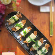 里脊肉、豆腐皮、大葱、香葱、料酒、生抽、白胡椒粉、鲜姜汁、番茄酱、甜面酱、白糖、香油。