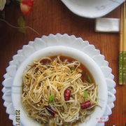绿豆芽、醋、酱油、盐、糖、香油、干辣椒、葱蒜、淀粉。