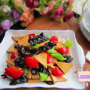 千页豆腐、木耳、青辣椒、红辣椒、葱、姜。