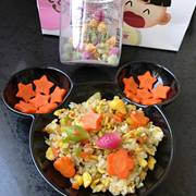 三宝妈海螺面、造型胡萝卜片、鸡蛋、辣椒、米饭、玉米粒、胡萝卜、盐、孜然粉。