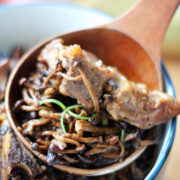 野山蘑菇、排骨、葱、姜、干辣椒、桂皮、八角、香叶、盐、老抽、生抽、冰糖、高汤。