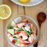 鲜虾、水蜜桃、西芹、红椒、香菜、柠檬、松子仁、盐、沙拉酱、橄榄油。