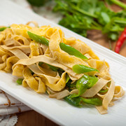 豆腐皮、青椒、鸡蛋、玉米油、盐、淀粉、味精、大蒜。