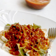 蝴蝶面、牛肉粒、洋葱、大蒜、西红柿、蘑菇味意大利面酱、香菇、胡椒粉。
