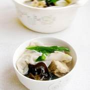 鸡腿、木耳、油菜、云吞皮、葱、姜、盐、味精、胡椒粉、香油。