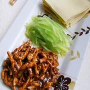 猪里脊、莴笋、豆腐皮、甜面酱、白糖、香油、酱油、料酒、蛋清、淀粉、姜丝。