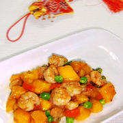 芒果、鲜虾仁、豌豆、胡萝卜、鸡蛋。